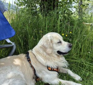 Er kann aber auch einfach nur dabei sein, gemütlich neben einem auf dem Boden liegen und warten, bis er wieder aktiv sein darf.